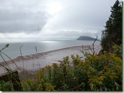 We finally got settled in Fundy at the open campground but the weather was still pretty gloomy this morning with fog and drizzle. We went back through the covered bridge and went for a walk along a boardwalk and down to the foggy beach. Later it cleared up and finally we saw the sun so we could dry out. We walked into the little village of Alma for ice. The boats on the Upper Salmon River have to settle on props when the tide goes out: