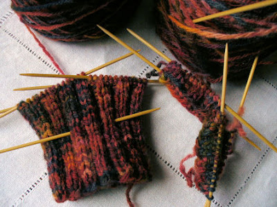 So for TV knitting, as I mentioned yesterday I’ve started on the free Berroco pattern, Jacoby. These are gauntlets knitted in sock yarn but I’m using a 3ply sport yarn that I completely spun with spindles. I started socks with the undyed yarn a long time ago and frogged them. Then I dyepainted the yarn in one of my Dye Day sessions. So now they are becoming long ribbed fingerless mitts instead of socks. So far I’m liking how they’re turning out even though they are quite thick. My modification of 56 stitches around seems to be a good size. This is how far I got while watching Heroes and Inspector Lynley last night: